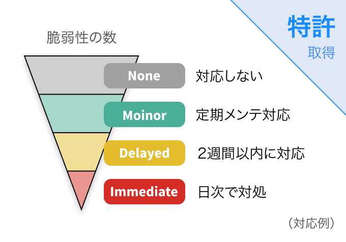 特許取得のロジックで、危険度、外部からのアクセス可否、攻撃手段の公開有無から、対応の優先順位を自動判定。