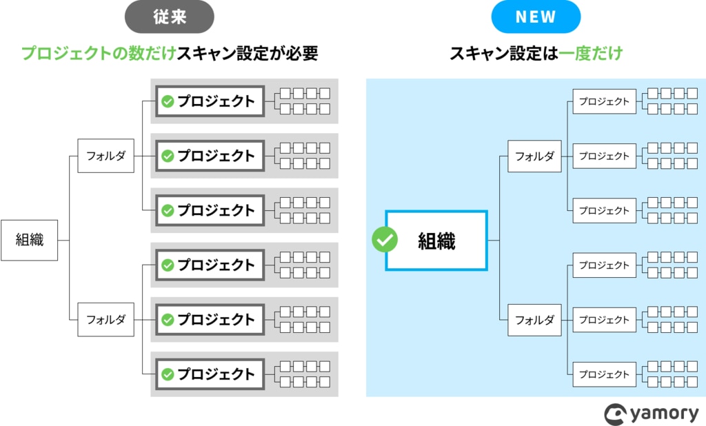 「Google Cloud 組織連携機能」は、「プロジェクトをまとめる組織またはフォルダ」を登録すれば、配下のプロジェクトを自動で収集し、yamoryへ連携することで、作業と管理コストを大幅に削減します。