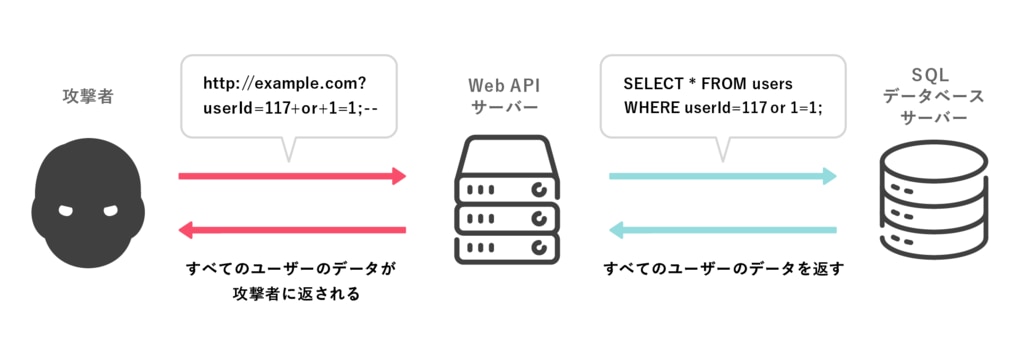 上記のようなクエリが生成されると 1=1 というステートメントは常に true となってしまい、データベース内のすべてのユーザー情報を返してしまうことになるのです。
