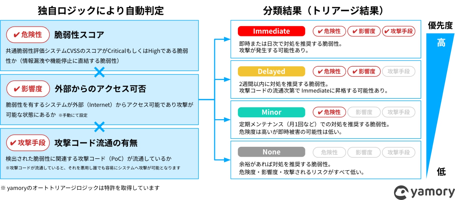yamoryの「オートトリアージ機能」は、CVSS深刻度、攻撃コードの有無、公開サービスかどうかなどの情報を複合的に分析し、脆弱性の危険度を自動判定する機能です。 今回リリースしたカスタマイズ機能では、この自動判定のロジックに対し、組織独自のリスク評価基準を組み込むことができるようになりました。