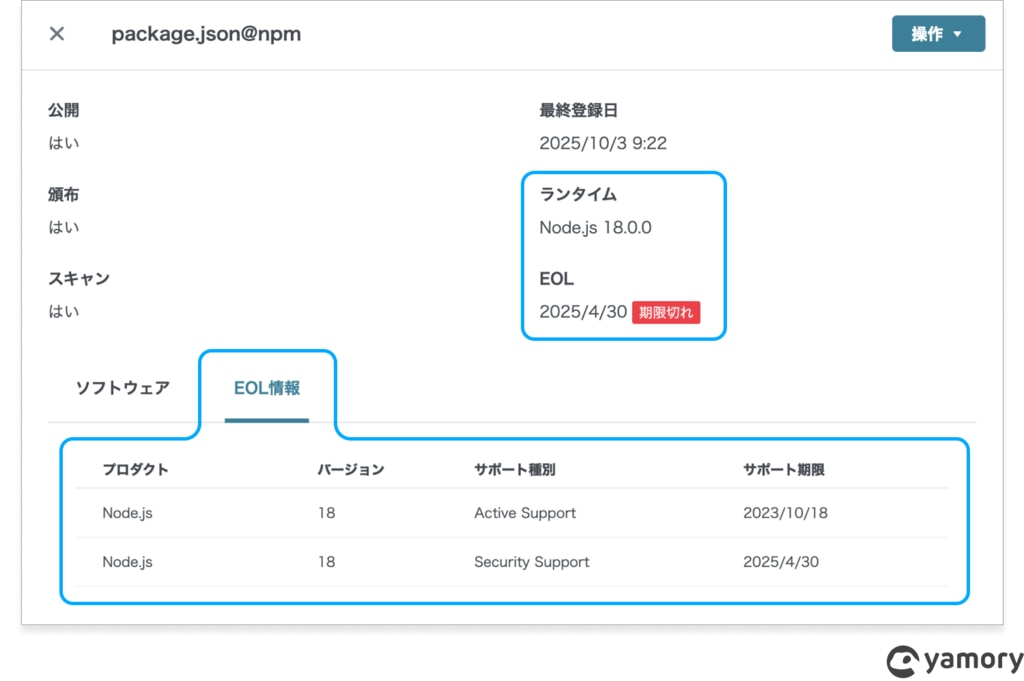 yamoryのアプリライブラリスキャン時に、スキャン対象プロジェクトのマニュフェストファイルからランタイム(Node.js、Java、PHP、Go など)のバージョンを自動で取得できるようになります。取得した情報に基づき、yamory独自のデータベースと照合することで、該当ランタイムのEOL検知を自動で行います。